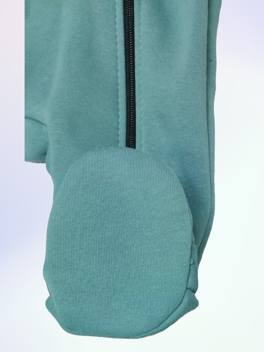 Комбинезон с закрытыми ножками, с капюшоном на подкладке, на молнии по всей длине и до конца одной ножки.