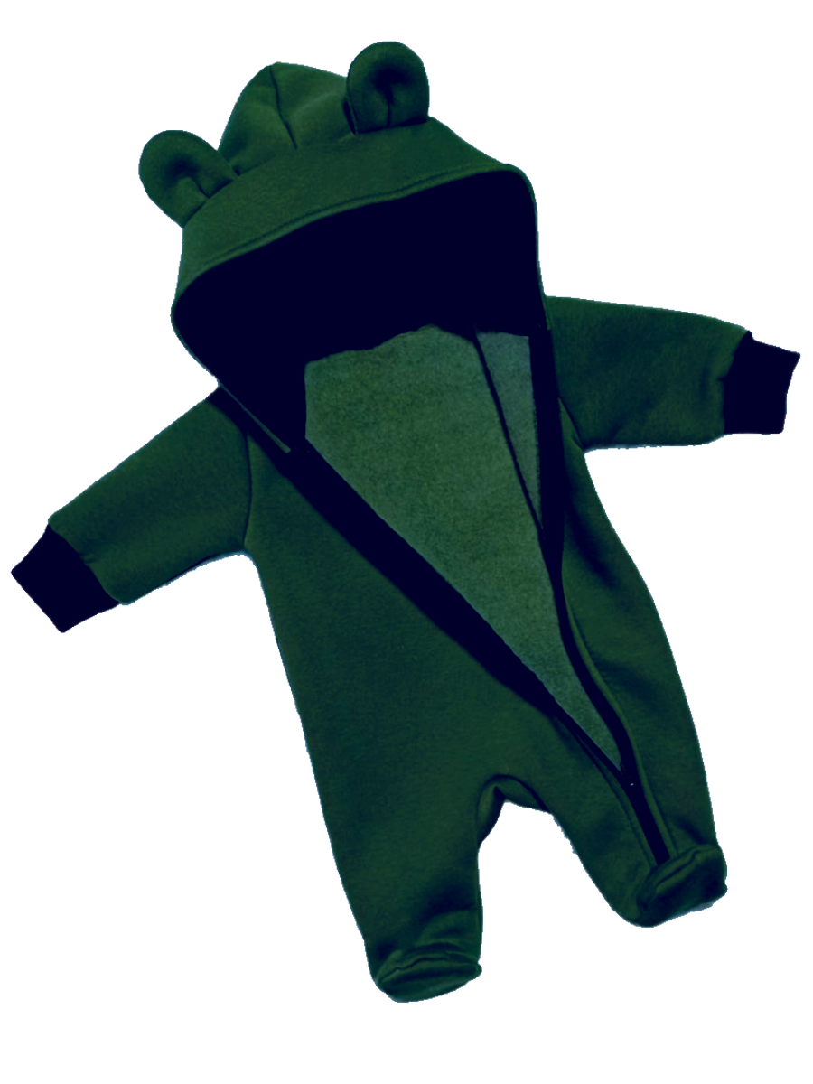 Комбинезон с закрытыми ножками, с капюшоном на подкладке, на молнии по всей длине и до конца одной ножки.